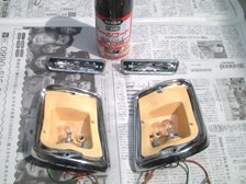 (4月9日)再利用するフロントバンパーの裏面にPOR15シルバーを刷毛塗りしました。室内足下の外気導入口は片側が割れていたので補修して車体に装着しました。ウインカーレンズは色が飛び気味だったので裏面より塗装をして正常な色合いに戻しました。ステップバンの荷室に積んで保管していた邪魔だったシートを仮置きしてみました。でも茶色はなぁ・・・(T_T)。再利用不可能かもと思っていたフロントエンブレムも再塗装により良い感じになりました〜(^_^)v