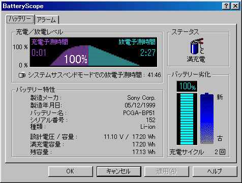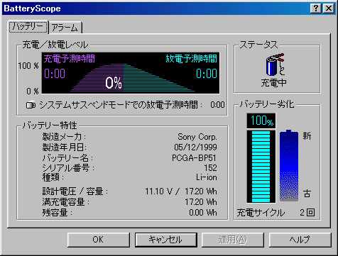 こんな感じでバッテリー状況が表示されました。充電中のアイコンが出ているものの・・・・充電予想時間などすべて「0」です(^ ^;)。