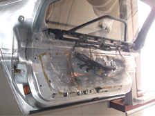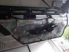 (8月20日)昨日に、ドアを閉めると「ガシャン」ってドアの中で何か音が鳴るのです。内張を外すと・・・・。パワーウインドウモーターを固定しているステーが折れていました。当車両はダメな純正モーターから定番の外品モーターに交換されている為、ステーで固定されています。そのステーがいい加減な作りなので折れた模様。手持ちのステーを似た様に曲げて修理完了。これもいい加減な作りのステーですね(笑)