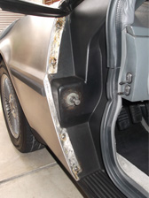 (3月31日)運転席側のドアのチリが合っていないのが気になっていました。ドアを開けた状態でヒンジの固定部分を調整してみます。そのためにダンパーを外しました。デロリアンのドアは「ねじり棒バネ」と「ストラットダンパー」で開閉を手助けしています。一番上げた状態よりも更に開けられる様にルーフパネルを外しての作業を行いました。色々と格闘して、まぁまぁマシにはなりましたが納得いかず・・・
