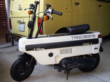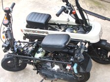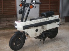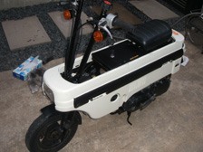 (6月5日)モトコンポ3号機がやってきました。我が家の1号機はピカピカ状態で健在ですが2号機はN360のレストアの時に旅立ってしまいました(^_^;)。やはり2台手元に置いておきたいので購入しました。状態は今までの中で一番最悪の状態でしょうか・・・。エンジンは不動状態、ボディーシールは剥がされ、右側面カウルは割れ&変形、テールレンズ割れ、内部もオイルまみれで、かなり走行しているモトコンポのようです。最近まで走っていた車体だそうです。調べるとプラグから火が飛んでませんでした。CDIかコイルかジェネレータあたりが問題なのかな?!1号機の部品と入れ替えて調べようと思いましたがあまりにも汚いので3号機を触った手で1号機を触れないので、先に綺麗に仕上げてしまう事にしました。今日は外装外しで終了〜。