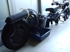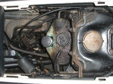 (9月28日)1ヶ月ほど前に駐めてあったモトコンポからオイルが漏れガレージがオイルまみれで汚れてしまいました。とりあえずオイル受けの上にモトコンポを載せてしのいでいましたが、時間が出来たので原因を探します!。ボディを外して素っ裸に(笑)。ガソリンタンクとオイルタンクを外すと・・・・。オイルタンク下部のオイルフィルターが入っている「オイルストレーナージョイント」というゴムに亀裂がパックリと出来ていました。ここから漏れだしてオイルタンクはスッカラカンになってエンジンをオイルまみれにしてしまったようです。はたして部品は手にはいるのか?!。オイルまみれのエンジンを掃除する為にフレームからエンジンを分離して終了。決してモトコンポのロンスイ仕様を作るわけではないですよ(^_^;)。