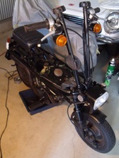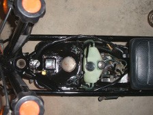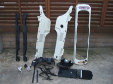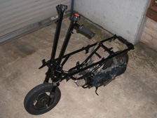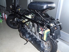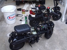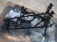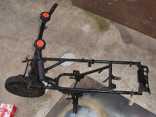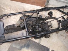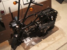 (6月12日)フレームを足付け研磨してマスキングして塗装。乾燥待ちの間にボルトナットを灯油で粗いパーツクリーナーですすいで終わり(再メッキは今回は無し)。とりあえずフレームにエンジンや車輪を装着。