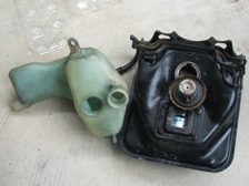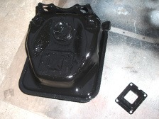(6月15日)ガソリンタンクとオイルタンクを装着しないと他の作業が進められないのでガソリンタンクを仕上げました。最初に燃料ゲージやコックなどを外しガムテープで穴埋め。ボルトナットを数個タンクに入れて水を1/4程入れてシェイク・・・。これで6/7のタンク水洗い後に内部に発生させてしまった大きな錆(笑)は落ちました。続いてタンクにサンポール1本と熱湯満タンを入れて錆び落とし。この段階で良く揺さぶってボルトナットが内壁を転がるようにする。15分ほど経ったら排水&すすぎ。台所用洗剤を小さじ1程入れて内部洗浄&すすぎ。ついでにボルトナットも排出。ラストリムーバー(ボトルの1/3)と熱湯満タンを入れてリン酸皮膜を生成(10分程で排出)。すすいでドライヤーで強制乾燥させました。勢いに乗ってタンクをウレタンの黒で塗装しました(外の錆落としは適当(^_^;))。