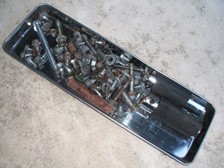 (6月10日)ハンドル周りのスイッチ類やウインカーを除去。そして汚いエンジンを工具をドロドロにしながら降ろしました。エンジンは、3時間ほどかけて銀色が見える状態まで洗剤&ブラシ掃除完了。ジェネレーターに水入りまくったかも(^_^;)