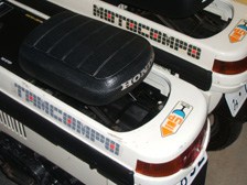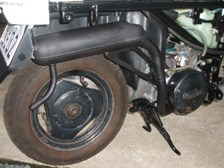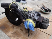 (6月19日)本日はナンバーを取得してきました。次に昨夜作ったトップカバーを装着して1号機と並べると貼り位置が違いました・・・・。3号機のトップカバーのシールの張り方は誰かが以前張り直したのか解りませんが間違っていた様子。余分に作っていたので剥がして張り直しました。手つかずだったマフラーの錆を落として耐熱ブラック塗装を行いました。ステーの溶接が取れていましたが針金で修正(^_^ ; )。オイルタンクにオイルを入れガソリンタンクには混合ガソリンを入れて燃料コックをひねると一発始動でした!。オイルポンプを操作して新しいオイルチューブ内へオイルを充填させて近所を試走行しました。1号機よりよく走るのに驚き・・・なにかいじってあるエンジンだったりして。エアクリBOXも洗浄して装着(クリーナーのスポンジはボロボロだったので現在無し状態)。最後の写真は足らないボディーステッカーの試作を仮留めした様子。純正を買ってくるか色々と迷ってます。