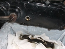 (6月21日)購入時より変な自作ステップが装着されていました。まだ純正が手に入ってないのでとりあえず変なのを装着しました。純正よりも短いので足がクランクケースなどに当たってステップに足が乗りません(T_T)。6/12にエンジンを搭載してから何故かクランクケースのブリーザーパイプ付近からオイルのような物が垂れてきていました。モトコンポはVベルト駆動ではなくチェーン駆動でクランクケース内はオイルが入っているので、そのオイル量を確認してみました。点検のボルトを緩めると・・・ダァ〜〜〜とオイルが(^_^;)。ボルト穴に油面が来るのが正解なのに入れすぎです(前オーナー)!。ついでだから全部抜いてオイル交換する事にします。ドレンはクランクケースを留めている下部のボルトの1個がドレンボルトになっています。サービスマニュアルを見ながら間違えないように緩めて排出。手持ちのオイルでステップバンやN360では使えないと判断したゴミ「カストロールXLX(鉱物油10w-30だけど柔らかすぎで各パッキンから漏れる)」の余りが1リッターほど有ったのでそれを入れました。サービスマニュアルでオイル量は0.41リットルですが1号機のクランクカバーのコーションシールには交換時0.5リットルの文字が・・・。0.5リットル入れておきました。ついでに1号機も交換しておきました。