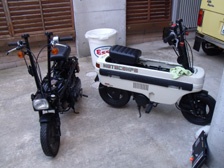 (6月22日)モトコンポのボディーを留めるボルト12本はラバーワッシャーが噛ましてあるのですがボロボロでなくなってる部分がありました。純正品や社外品を買えばよいのですが結構良い値段しているのでゴムシートと穴開けポンチを使って作成しました。1号機の分も作ったので24個+αです。少し外形が小さすぎましたが機能は問題ないので今回はこれで行きました。ボディの遊びが無くなってビビり音が無くなりました。3号機は調子よくエンジンが回るのですが1号機はチョークを引っぱっていると丁度良いという状態だったのでキャブのエアースクリューを見ると戻しすぎていました・・・(何やってるんだか10年前の僕(^_^;))。つづいて3号機も1号機もガソリンタンク内のガソリンを抜いて、新しいガソリンを満タン入れました。これで2台ともお出かけできます(^_^)v