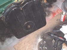 (2月6日)わーーーい!。やっと燃料タンクのパイプが開通しました(^_^)v。車がやってきて2ヶ月目での開通です。初めは錆取り剤で挑戦し、次に針金でつつき、そしてメーターワイヤーをドリルで・・・でもダメでした。今回は自転車のブレーキワイヤーでのドリル装着で開通しました。メーターワイヤーではパイプ奥の90度曲がっているところを太すぎて曲がってくれてなかった模様です。とりあえず一歩前進です。