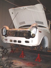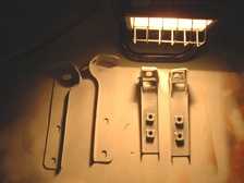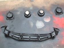 (4月10日)リアのバンパーステーをRS-R1000より取り出しフロントバンパーステートともに錆止め塗料で塗りました(寒いので強制乾燥中)。フロントバンパーを仮装着してみました。車っぽくなってきました。でもメッキが汚いので車がボロく見えます。リアバンパーは程度の良いN2(ツー)の物を手に入れていたのでステーを付けようとした所・・・どうやら今までN3(スリー)のが付いていた様で錆取りしたステーはN3(スリー)のでした。下部のビスを止めなかったら装着できそうです。