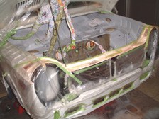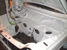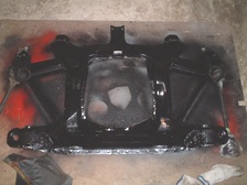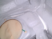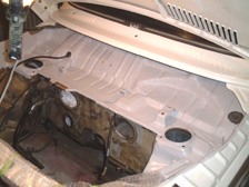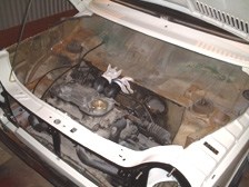 (4月19日)左右のショックASSYとステアリングラック関係を外しブレーキクリーナーなどでエンジンルームの油汚れを落としました。ブレーキクリーナーが足らずお掃除はまだ途中の状態ですが、汚れ落としの完了した上部からエスコを刷毛で塗りました。上塗りの色はボディ色で行く予定ですが刷毛で塗ろうかガンで塗ろうかちょっと悩んでます。今回、フレームの車体番号周辺は未だ塗っていません。塗料を乗せると違法(^_^;)だそうですがステップバンでは塗っちゃってます(笑)。車検時に番号を確認しにくそうです。今回は最後に薄くボディ色を乗せるだけにする予定です。
