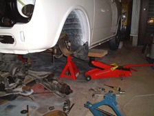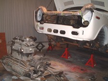 (4月18日)助手席側の車輪をコンクリートブロックでしっかりと止めて水道管で延長した工具を使って無事にナットが緩みました。勢いに乗ってブレーキのバックプレートなどを外し車体をどんどんジャッキアップしていきます!手持ちの馬で最大限に上げてもあと数センチでバルクヘッドがくぐれません(T_T)。しかしヘッドカバーを外したら無事通過。明日からは磨きに専念できます〜(^_^)v。馬に乗ってるNの姿がイナバウア〜って感じです(笑)。応援に駆けつけてくれたO岸Jrさんありがとうございました〜