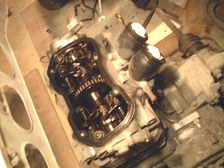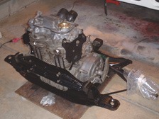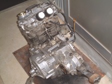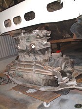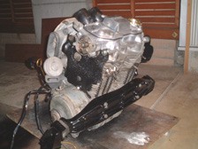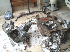 (4月14日)マフラーを外しました。太鼓は借り物なので返却しなきゃ〜(^_^ ; )。エンジンのサイドカバーを外しました。エンジンを降ろすにあたってエンジン寄りのドライブシャフトの連結部をはずそうとしてネジを緩めるとオイルたら〜っと漏れてきました。サービスマニュアルを確認するとドライブシャフトごと外すようなので元に戻して終わり。エンジンを降ろすには台車と3人の人間が必要な模様・・・・