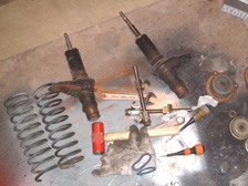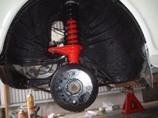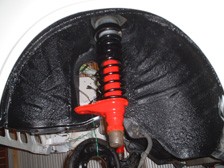 (4月22日)エンジンルーム内の錆び落としをしている時にシーラーの一部も一緒に剥がしちゃってたのでシーラーを数カ所施工しました。そしてボディ色を塗装しおそるおそるマスキングを剥がしました。マスキングし忘れもなく無事に綺麗なエンジンルームが仕上がりました。4/19の塗装前の写真と比べると塗って良かったと満足〜(^_^)v。続いてサブフレームからエンジンを降ろしてエンジン掃除を始めました。予想以上に汚く、ブレーキクリーナーとブラシでは十分な掃除が出来ません(T_T)。シリンダー部分は空冷の為、フィンがいっぱいで独特の表面仕上げなので汚れも落ちにくく諦めモードです。ほどほどの掃除にして積んじゃおうと思ってます。ヒーター使ったらオイル臭いだろうなぁ・・・。掃除がうまくいかない気分転換にショックを塗装の為に分解しました。サブフレームのボールジョイントからナックルは外れないわ、ドライブシャフトは抜けないわ、問題山積み(T_T)。工具代がかかりそう〜(T_T)