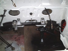 (4月25日)エンジンサブフレームの下面を塗装しエンジン搭載準備が出来ました。続いてステアリングラックを装着しステアリングとのリンクも元通りに戻りました。エンジンルームからフロントダンパーの赤い塗装が見えるのが快感〜(笑)。エンジン後部のエンジンマウントがへたっている為、エンジン搭載した状態で室内のシフトリンゲージの位置がわずかに下過ぎていたのを思い出しマウントの固定ボルトの間にダミーナットを噛まして浮かせる加工をしました。