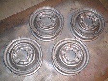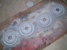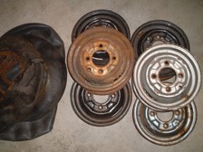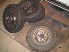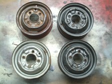 (8月28日)8/26にコイル移設&プラグコード交換をした後、アイドリングが下がって空ぶかし後にアイドリングが低下する様な症状が出ていたのでプラグコードが原因かなぁ〜と疑い中です。アイドリングを少し上げただけで現在は調子よいですが、ちょっと長過ぎる方のプラグコードを少し短くしておきました。今まで面倒でなかなか手つかずだったホイルのレストアをしました。あまり程度の良いホイルではないのでおおざっぱな作業です。ホイル6本中、使えそうなのは4本でした。ワイヤーブラシで錆を落としペーパーなどを当てて、まず「錆封じ」を塗装。2時間ほど乾燥させ表面が半乾きの時にウレタンプラサフを塗装し、更にシルバーを塗装しクリアーで仕上げました。チューブはホイルの錆が多く付着していたのでブラシやペーパーで有る程度落としておきました。バルブコアが2本は漏れ気味だったので新品に交換して空気を充填し浮き輪状態にして明日まで様子見です。10インチだと自分でタイヤの組み付け出来るかなぁ〜。塗装の乾燥待ち時間を利用してリアトランクのウェザーストリップを取り付けました。トランク側の鍵部のネジが緩んでたのを発見しスプリングワッシャーを挟んで緩まないようにしておきました。これで異音が解決です(^_^)v。