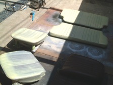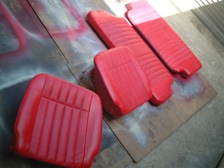 (9月2日)今日はシートを念願の赤に塗装?!しました。シートを外し水洗いブラッシングをして乾かしマスキングをして下地の白(アイボリー)を塗装しました。塗料は最近話題のテロソン社の「染めQ」です。下地はホワイトを塗るのが普通ですがアイボリーの1リッター缶と半分缶を安価に入手できたのでアイボリーで代用しました。これはガンで噴きました。続いて赤は関すプレータイプの物で塗装しました。5本購入していたのですがもう1本か2本欲しい所でした。見えない所やよく見るとまだらになっている部分があります(T_T)。でも塗った本人しか判らないのかもしれないです。嫁には見抜かれましたが・・・・。費用的には2万円ほどかかってしまうのでなかなか簡単にはできないですね(^_^;)。次に、ホイルキャップが一枚だけ違うグレードの黒塗装されていない部分が有る物を装着していたのでステップバンの時と同じくカッティングシートをリング切りし貼りました。本当はNUのホイルカバーをはめるべきなんですがステップバンのスペア用にストックしていた物を付けてます(^_^;)。ワイパーの写真は助手席側の固定位置を上げました。S800タイプミラーを装着すると運転席から助手席側のサイドミラーが見えないので困っていたのですが色々とインターネットで画像を見ていると上げている方が居られたのでなるほど!と思い固定位置を修正しました。運転席から非常に見やすくなりました。スピーカーですがのんきーさんに教えて頂いた足下の空気導入口を利用するパターンで行くことにしました。しかし購入したスピーカーは少し大きすぎて奥まで入りきりません(T_T)。そこで8/30に作成したスピーカーボックスから1面もぎ取り外形を更に修正してブラックレザーを巻いてバッフルボードを作成しスペーサーとして使い装着しました。空気の来る方向には吸音材を少し詰めておきました。でもヘッドライトから音楽なってました(笑)。もう少し吸音材を詰め込んでおく必要がありそうです。デッキは枠を付けると足下が狭かったので枠無しのまま再装着しました。明日はエヌで3台集まって再来週の長野行きの相談です〜。