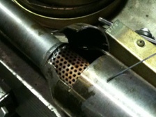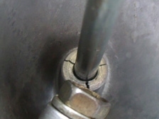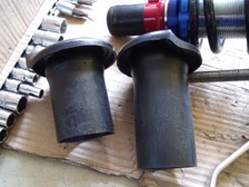 (9月22日)車高調部分のスリーブを装着するにはショックケース上面の蓋を一度外さないとくぐれないのでパイプレンチを購入し、家庭用万力を併用して緩めるのに挑戦してみた・・・・が外れず(T_T)。dukeさん&Tさんの会社へお邪魔して大きな万力に固定して頂き緩める事が出来ました。帰宅後スプリングロアシートを削り落とす為にグラインダーで削り始めました。しかし全周に溶接ビードが回っていたのでケースまで削ってしまいそうな怖さがあり、とりあえずスプリングが乗る部分を切り落としました。残りの部分は・・・・やっぱりグラインダーかなぁ・・・うーむ。難しそう。