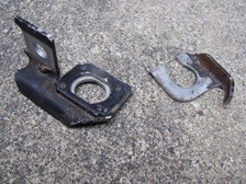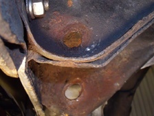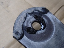 (1月18日)先週末のスペシャル板バネを車体に組んで具合をチェックしました。そこそこ良い感じに予定の姿でした。そしてシャックルを固定しているボルトなどを外そうとしていると・・・・・ポキッ(T_T)。シャックルの固定されていたシャーシ側の穴は何故か長穴加工になっちゃっていました。反対側は正常なのですが、このおかしな側は板金跡がある場所なのでその頃からシャックルが正常に固定されていなくてサスペンションの動きと共に削れて長穴になったのかなぁ〜?!。防錆塗料を買いに行って今日は終了。