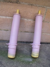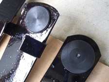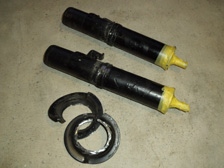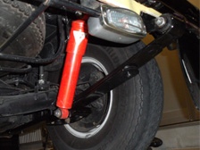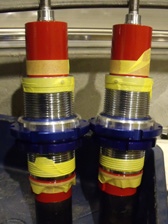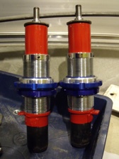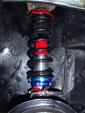 (9月28日)流用ショックのブレーキホースの固定部分をサンダーで切り落としました。そして塗装の為に足付け研磨を行ってからマスキング。以前に廃業板金屋さんから引き上げた無数にあるウレタン塗料から赤い色を物色。ストロングレッドベースとディープレッドベースを半々に混ぜ合わせてみました。ウレタン塗料だから、いきなり黒の上からでもいけるだろうと思って塗り始めましたが全然ダメでした(T_T)。急いでサフェーサーを準備し、赤い色を退避させた洗っていないガンにサフェーサーを投入。ちょうど良い具合にピンクサフェーサーで塗れました(笑)。その後、赤で塗装。スプリングは適当にシャーシブラックで塗装完了。換装を待ち、数時間後に組み立て開始です。錆対策のためにシリコンコーキングを3カ所ほど施工しておきました。やっと形になった感じです〜早く装着したい〜。