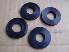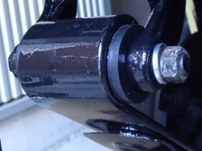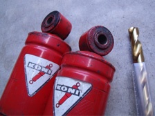(1月25日)リーフの塗装が乾燥したので組み立てです。貨物車ですから3枚目のリーフが有る訳ですが、3枚目にもブッシュが装着されています。もちろんボロボロになっていたので交換です。この部分は汎用品がピッタリと装着出来ます。シャックルとリーフの接続部分にはオートマLife製のスペシャルワッシャーを装着しました。無事に板バネ装着完了〜。準備していたKONIの取り付け穴を加工して装着!。やっと完成だぁ〜。作業中にネジ箱を蹴ってしまって時間ロスしたのが今日の失敗(T_T)