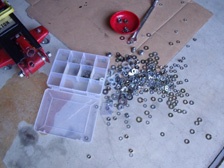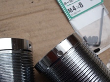 (9月24日)必要なネジやカラーとして流用出来そうなナットを購入。M12細目ナットがピロ下のカラーとしてギリギリ使えそう。ネジ式車高調部分はスチールなので本来は溶接固定ですが、イモネジで固定出来るように上部に3カ所穴を開けタップをたてる事に。3個目の穴にタップをたてているとタップが折れました(^_^;)。ストレートに行ってタップを購入してきて本日は作業終了。