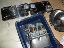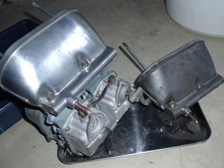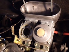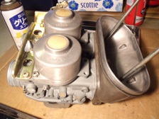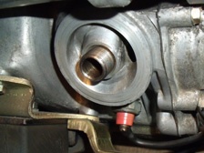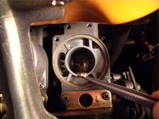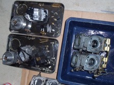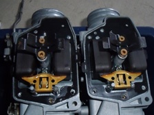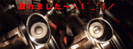 (5月24日)先日に綺麗にしておいたキャブの受け部分を交換しました。今まで付いていた部品のエアクリのスタッドボルトの部分の写真です。いつかポロッとアルミ片が吸気してしまいそうでしょ?(笑)。交換したので、もう安心!。キャブのジェットも交換しておきました。そしてキャブの左右の繋ぎ部品を外した訳なので同調を取り直して完了〜。