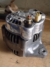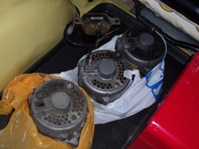 (5月9日)昨日にアブドン君からオルタネータをお借りする事が出来ました。ありがとうございます。早速、交換です。交換してエンジンを始動すると・・・・・チャージランプは点灯しません!正常です!。オルタだったのかぁ〜。過充電するのがオルタが原因だなんて(^_^;)。不安なのでもう一回、ダメだったオルタに戻しましたがチャージランプは点灯したのでオルタで間違い有りません。原因が判ってスッキリです!。今回は、これを機に入手して放置していたICオルタネータに交換する事にしました。ブラシの残量をチェックして外観を軽く掃除し装着完了〜。バッチリ発電してくれていてチャージランプも正常です。やっと治りました〜。この4日間、悩まされたなぁ〜(^_^;)。ステップバンの荷室は「オルタ祭り開催中」(笑)。不動になったスピードメーターはメーターケーブルがメーター裏で外れていただけでした。バッテリーやオルタの交換時にワイヤーに腕が当たり引っぱってしまって外れかけだったワイヤーを外しちゃった模様です。一件落着。