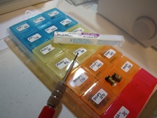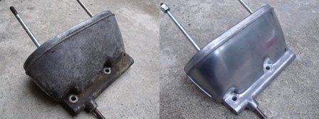 (5月21日)エコパでKABAさんより譲って頂いた予備ICオルタをお掃除しました〜。ブラシ残量もチェックOK!。今まで、あれだけ遠征していながら予備部品を一切車載していなかったので箱に詰めてみました。ICオルタ本体・ベルト・アクセルワイヤー・燃料ポンプ・燃料ホース・ヒューズ・カム・カムプーリー(カムとカムプーリーは今の調整式カムが心配だから・・・近々問題解決予定)。入れる箱は少しオシャレしてみました。久々にステンシルでシュッシューと文字をペイント。この箱、売れるんちゃう〜(笑)。続いて、キャブのエアクリ受けのパーツですが、今使っている部品のスタッドボルトの差し込み口に亀裂が入っているのを20年近く放置していたのが心配になってきたので予備の部品をお掃除しました。割れて破片がエンジンへ流れ込んだら大変ですから〜。昨日に作成したジェットの交換時に同時交換しようと思います〜