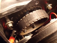 (6月15日)早速、装着してみます。その前にちょっとステッカーチューン。ファイナルステージ製のは、カムプーリーのTOPの印としてファイナルステージのステッカーの端がシリンダーヘッドの刻印ラインと一致する様になっていたので、同じようにSPIステッカーを勝手に作成し(笑)貼ってTOPが判りやすくしておきました。一緒に作成した進角度のステッカーはタイミングライトでFマークがピッタリ合う位置でスライド位置を固定すれば交換前の設定角度になるので装着して調整後に貼る事に。そして・・・作業完了写真・・・・忘れました。無事に修理完了してます〜