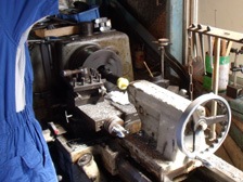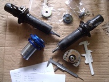 (9月23日)今日は、昨年にクーラー配管でお世話になったTモータースさんへショックを持って訪問してきました。そして巨大な旋盤でスプリングロアシートのリング部分の溶接を削り取って頂きました。スッキリと綺麗に筒状に戻りました。使う予定のスプリング&アッパーシート&ダストカバーを軽く洗っておきました。