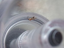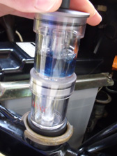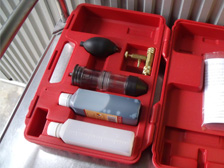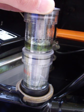 (3月25日)イベントの道が塩カルだらけで汚れちゃったので洗車。そして乾かすために近所を走行。イベントの時に色々な方と謎のオーバーヒートの話をしていましたが、みんなの意見はやっぱりガスケット抜けでは?!という感じ。そこで昨年の6月に買ったままだったヘッドガスケットリークテスターを使ってみました。この検査セット、ニーハオ製と思われますが、透明のシリンダーの中に虫の死骸が一匹いました(^_^;)。今までは、ラジエターからブクブクと気体が出てくる状況を再現出来なかったのですが、洗車後の乾かす走行をしてガレージに戻ってラジエターリザーブタンクを見ると、ゆっくりプクプクと気体が発生しているみたいなので検査してみました。測定器の上の部分に青い液体の検査薬を入れてラジエターキャップを外して押し当てます。エンジンを始動し暖まってくるとブクブクと出てきた気体が測定器の中へ入ってきます。その気体がCO2(二酸化炭素)だと検査薬が黄色に変化するのです。少し時間がかかりましたがゆっくりと黄色に変化していきました。黄緑って感じかな。どうやらヘッドガスケット抜けで間違いなさそうです。もっと早くに検査すれば良かったのですが、プクプクなるのは数百キロ走った後でしか発生しない感じだったのです。オイルもラジエター液も汚れないヘッドガスケット抜けだなんて・・・珍しいケースでしょうねぇ・・・。さてエンジンを軽く分解整備するのに部品を調達しなくちゃ〜