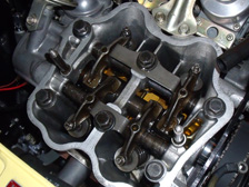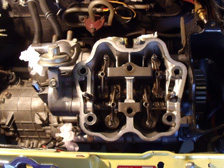 (7月31日)ヘッドカバーを外してオイルを注入です。ラジエター液も注入。ATFを入れようとしたらゲージキャップが堅くて開かない・・・。バイスやディスクブレーキセパレーターなどを使って、やっとカキンって音がして緩みました。ATFも注入。プラグも交換。フルトラの配線を外してクランキングしてオイルを潤滑。そしてエンジン始動!。無事にエンジンはかかりました〜。でもマフラーの接続部分を締め込んでいないので排気漏れで爆音です(笑)。とりあえずエンジンがかかったのでホットしてます。ヘッドはノータッチでしたので点火時期もOK。タイミングベルトの掛け違いも無いという事ですね。
