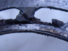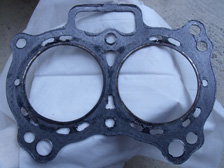 (5月7日)エンジンヘッドを降ろしました。ヘッドガスケットを確認するとリンググロメット部分に亀裂を何カ所も発見することができました。これが原因で排気ガスがラジエター液通路の方へ回って、ブクブクしていた模様です。分解して原因が特定できなかったらどうしようって思っていましたが、スッキリと原因を発見できました〜