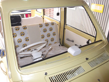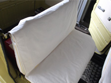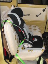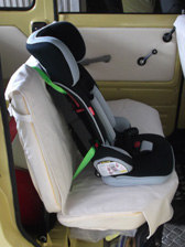 (4月6日)デロリアンに使ってたチャイルドシートをステップバン用にしたので装着の確認。縛り付けるベルトを付けるにはリアシートの白いシートカバーに穴を開ける必要があります。