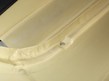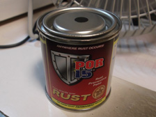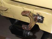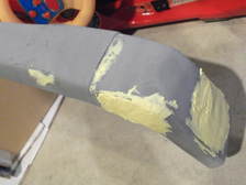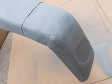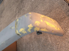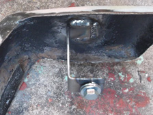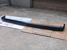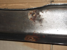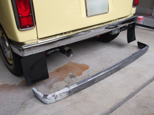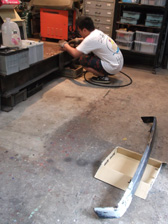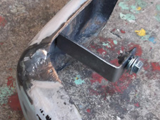 (9月11日)延ばし板バネを装着していた事によって痛んでしまったメッキリアバンパー。自業自得の10万近い痛手です・・・・。板バネ変更でこれ以上は酷く痛まないと思いますがステーの一部が固定できていない状態なので長距離イベント遠征時に脱落しないか心配です。とりあえず秘蔵のちょっと錆びた新品バンパーを再メッキするまでの間、仮のバンパーが欲しかったので入手。程度良好と思ってたんですが、塗装を剥離するとパテが出てきたりステーが1個無かったり、千切れてる部分が有ったり(T_T)。旧車仲間のところへ行ってステーを作成し溶接してもらって、千切れてた部分も溶接で繋いでもらいました。全体的に研磨して防錆剤を塗装。あとはパテを入れて形状をととのえなくっちゃ。