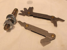 (9月4日)板バネの交換です。今回は以前の様にアルミブロックでのローダウン。純正の板バネ3枚を共締めしている純正ボルトではアルミブロックを共締めできないので長いボルトを用意。用意というかネジ箱の中に20年以上前に同じ事をした時の余分のボルトがありました〜。頭の部分が丸にしないとホーシングにハマらないのでグラインダーで研磨。ブロックは1年半程前に旧車仲間に他社種のを加工してサイズ指定で削り出してもらってました。板バネ同士のスラストブッシュは現在使用中のが程度良く残っていたので再利用。無事に交換完了。リアバンパーに当たっていた板バネが当たらなくなりました〜v(^_^)