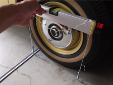 (9月13日)先日に旧車仲間の秘密サティアンに行く時に速い速度(笑)で走ってる時、フラフラしたのです。トーアウトになってる?!リアに合わせてフロント車高も1cm下げた事によってアライメントが狂ったみたいなのでいつもの簡易測定からの調整を行いました。インでもアウトでもなくゼロ設定です。これで高速走行も楽チンかな(^^)v。エンジンルームの丸型のコーションが汚れてたので作成。