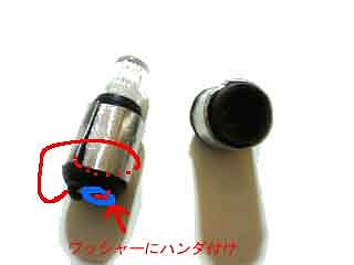 途中の写真が無いですが、この様になります。ウェッジソケットから出る+線は5mmほどで切り落とし被服を剥き、ワッシャーをハンダ付けしました。マイナス線はU字型に曲げソケットの周りにぐるぐると・・・・。それをアルミの板でペンチで挟み込んで出来上がり!